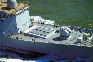 Close up of the bow showing the 32 VLS cells for HQ-16 and the 76 mm gun